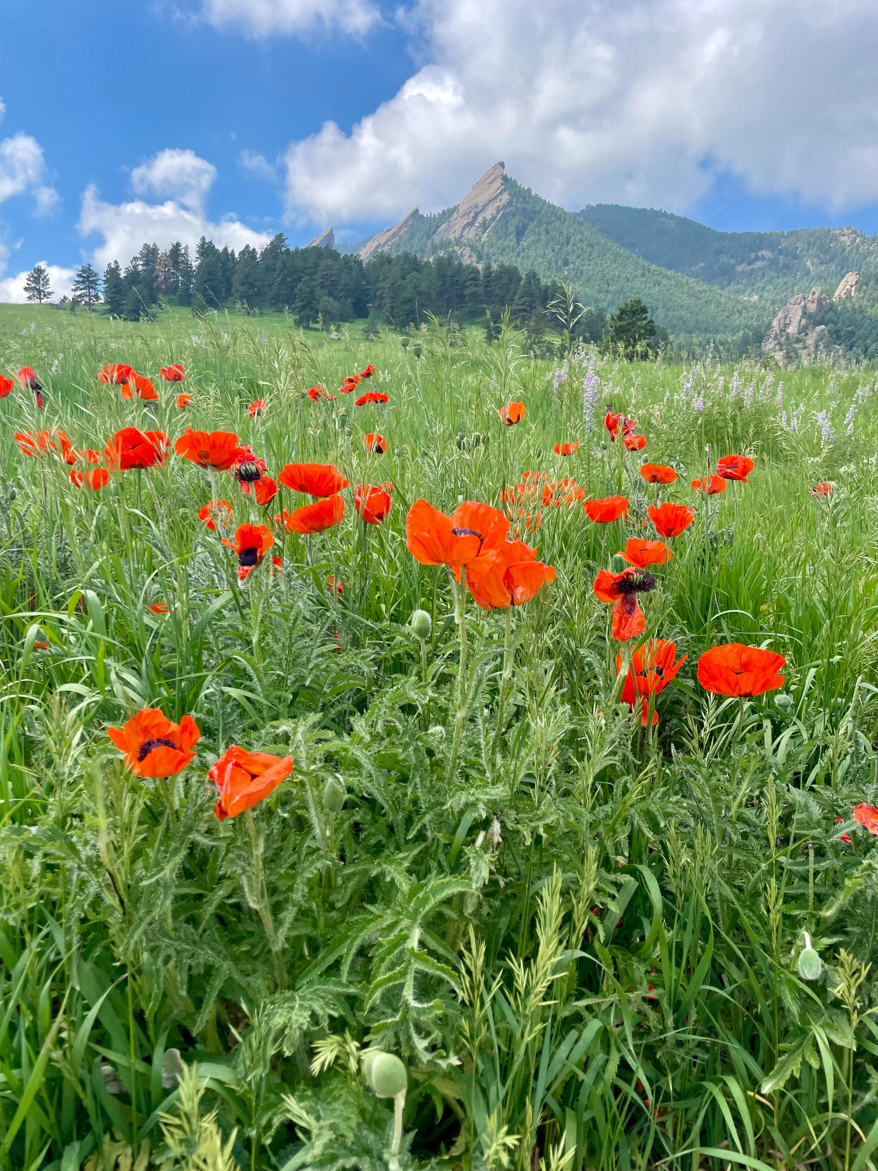 Papaver rhoeas dancing beneath the watchful eye of the Flatirons — Boulder, Colorado